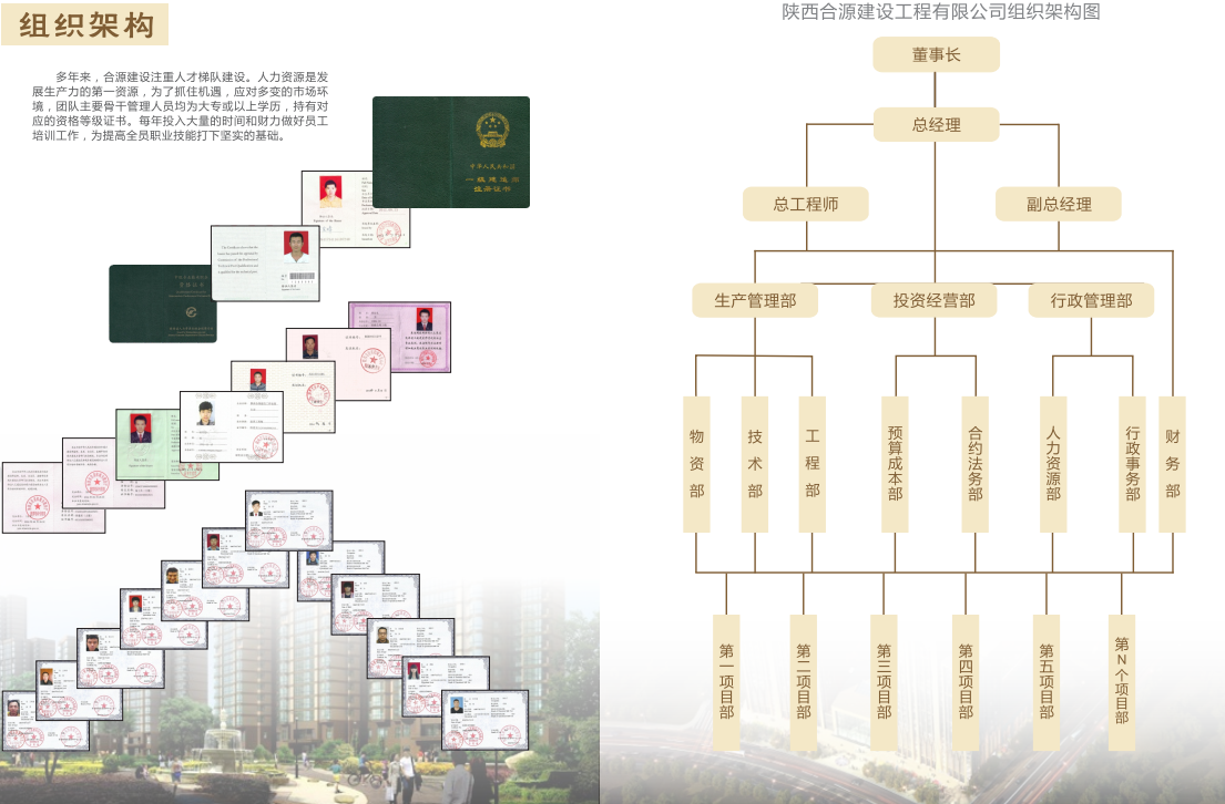 合源建设具有各类专业管理、技术人员百余人,是一个科学化、年轻化、高学历、善于创新的施工理队伍,现有固定作业员工达干余人,员工队伍稳定,综合紊质稳健,定期定岗培训,人人持订上岗,公司还建立和完善了生产管理体系、质量管理体系、安全管理体系等一系列管理制度,并有效地得到执行和落实。