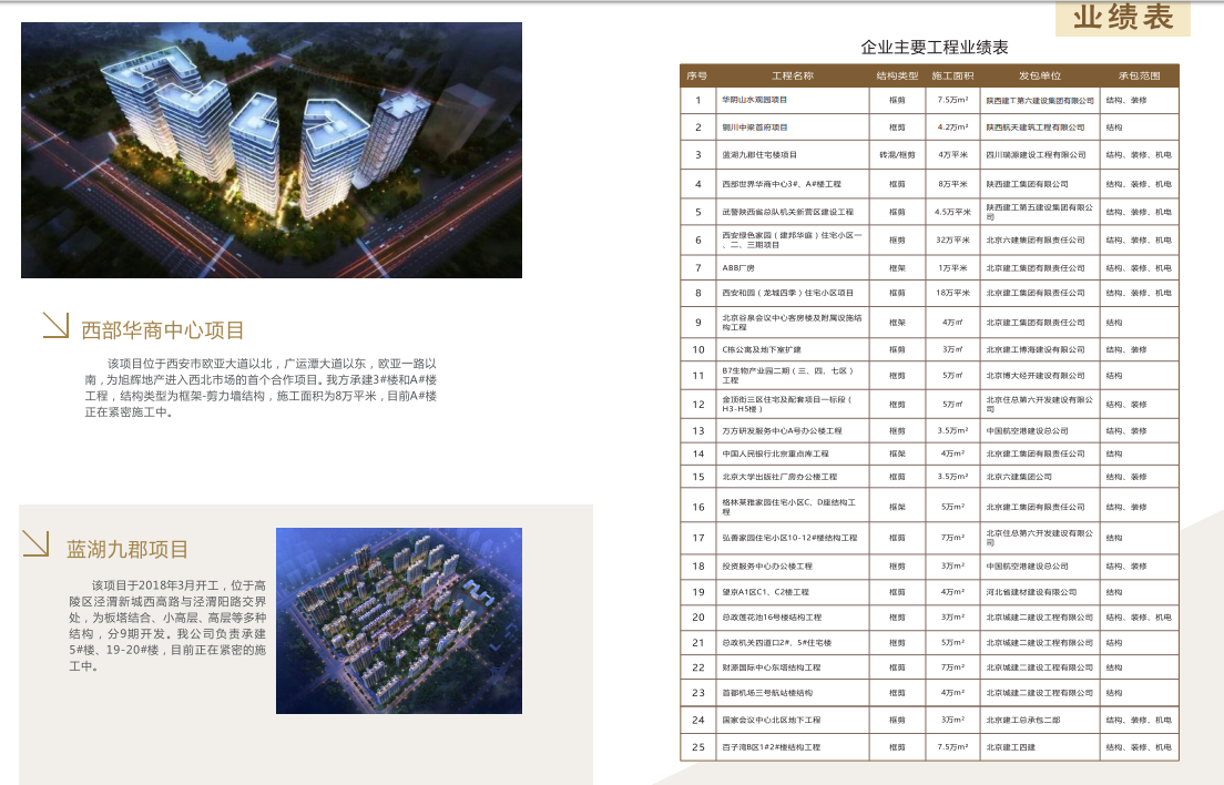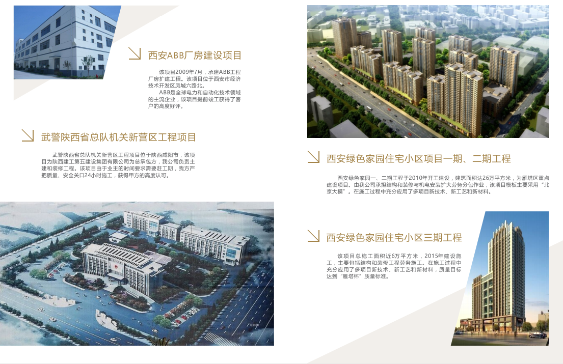 合源建设响应国家西部大开发战略的号召,凭借自身的优势条件和区域布局,为便于在西部发 展,成立驻陕机构“陕西合源建设工程有限公司”,井承接了北京建工集团总承包部西安分公司承建的西安市和园住宅小区高层全现浇商住楼结构与装修、机电安装工程,工程单体面积5万平方米施工总建筑面积15万平方米,创“省级安全文明工地”;施工过程中,公司相继承接了ABB广房建设工程,西安绿色家园住宅小区32万平方米的结构与装修、机电安装工程;承建武警陕西省总队机关新营区工程;承接西安高陵区蓝湖九郡住宅楼工程等多个项目,公司利用多年在北京的施工经验,结合西安的本土环境,以创优质工程、建一流队伍为目标,不断发展壮大,取得丰硕成绩,工程优良率达100%,并赢得了建设单位、总包单位、政府管理部门的肯定和认可。