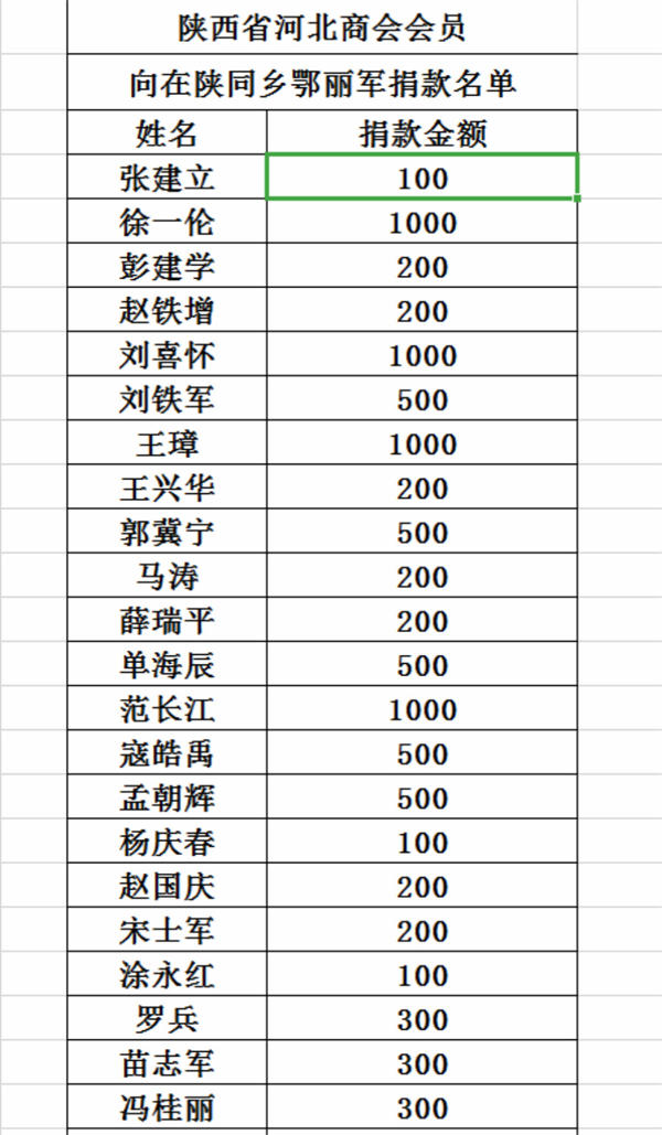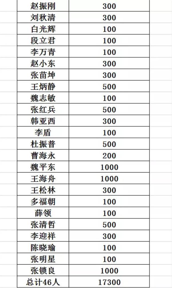 今年3月7日,看到鄂丽军的求助信后,陕西省河北商会领导高度重视,立即通过微信群等方式,动员商会会员、同乡积极为患重病的鄂丽军及亲人捐款奉献爱心,在短短的半个月时间里,46名商会会员捐款17300元,虽然捐款数额不是很多,但充分表达了我商会对鄂丽军及亲人的同情和支持。